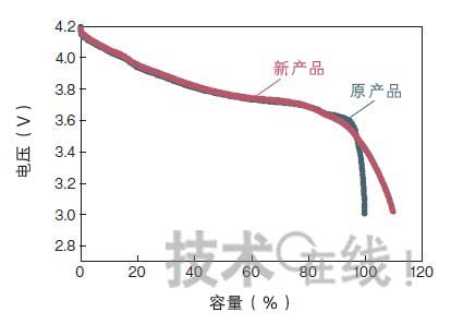 放電曲線與原來相同 新產(chǎn)品的最大特點是,具有與原有鋰離子充電電池幾乎相同的放電曲線,并且實現(xiàn)了高容量化(圖1)。由于充電電壓和工作電壓與原來的鋰離子充電電池相同,因此產(chǎn)品廠商無需改變產(chǎn)品的電源系統(tǒng)即可利用。