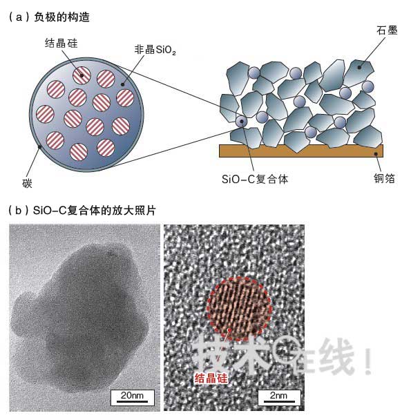負(fù)極采用日立麥克賽爾量產(chǎn)的硅類材料的單元混合了SiO-C復(fù)合體和石墨(a)。SiO-C將nm級的硅分散到非晶SiO2的構(gòu)造體內(nèi)(b)。圖由本站根據(jù)日立麥克賽爾的資料制作。
