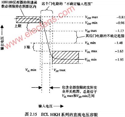 圖2.15舉例說明了MOTOROLA10KH射極耦合邏輯門電路在25℃環(huán)境溫度條件下的電壓容限,這此邏輯門電路都是對輸入電壓敏感,保證0和1轉(zhuǎn)換的電壓門限在圖中以VOLMIN和VIHMAX數(shù)值形式表示。接收到的電壓低于VILMIN則保證為邏輯0響應(yīng),高于VMMAX則保證為邏輯1響應(yīng)。落在兩個(gè)門限之間的接收電壓可能被接收電路判決為1,也可能為0,或者為一個(gè)不確定狀態(tài)。