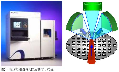 暗場檢測技術(shù)作為檢測晶片缺陷的有效手段之一,其優(yōu)點(diǎn)在于以下幾個(gè)方面:首先,在暗場獲得圖像的灰階易于控制和調(diào)節(jié)。暗場是位于硅片上方和硅片成30度角的區(qū)域,在此區(qū)域內(nèi)獲得的圖像灰階,可以通過調(diào)節(jié)激光的能量和探測器的敏感度來輕松控制;其次,在暗場內(nèi),可以很容易地辨認(rèn)有具體形態(tài)和位于硅片表面的缺陷,比如刮傷、微粒之類的缺陷;最后,使用暗場的檢測速度非???,成本相對比較低,通常被用作快速分析影響產(chǎn)量的各類缺陷超出界定值的問題,AIT和COMPASS是在半導(dǎo)體制造企業(yè)廣泛應(yīng)用的暗場檢測設(shè)備(如圖2和3所示)。[page]