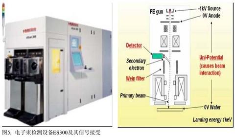 首先,它擺脫了照明光源,檢測結(jié)果不會(huì)受到類似變色、厚度不均等各種層面所帶來的物理因素的影響;其次,電子束的分辨率極高。因?yàn)樗臋z測單位是電子,電子要比微波以及任何尺寸的顆?;蛉毕荻家〉枚?;再次,電子是帶有電性的電荷,所以它可以被用于分析材料的電性或電組織成分,這被稱作電壓對比度圖像,經(jīng)常被用于檢測類似開閉鎖等電子電路缺陷和通孔蝕刻不足等材料缺陷。電子束檢測設(shè)備一般有KLA-Tencor和HMI公司的Escan系列(如圖5所示)。