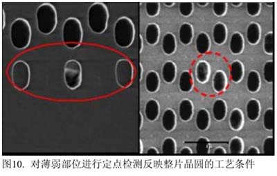 自動(dòng)工藝檢測技術(shù)是對電子束檢測技術(shù)補(bǔ)充。在實(shí)際生產(chǎn)過程中,常常能發(fā)現(xiàn)通孔刻蝕的一些系統(tǒng)性缺陷,它主要由于刻蝕設(shè)備及其工藝在調(diào)試過程中還沒達(dá)到最好的工藝窗口,或者工藝窗口的漂移使刻蝕設(shè)備的一些薄弱部位提前顯現(xiàn)在通孔刻蝕工藝過程中。實(shí)驗(yàn)過程中通過對一顆產(chǎn)品的薄弱部位進(jìn)行定點(diǎn)檢測,來反映整片晶圓的工藝條件(如圖10所示)。