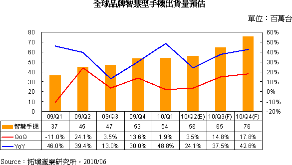 受到新興市場(chǎng)換機(jī)潮與新用戶的加入,以及成熟歐美市場(chǎng)新規(guī)格、新應(yīng)用的持續(xù)推出等因素激勵(lì),拓墣產(chǎn)業(yè)研究所預(yù)估2010年全球品牌手機(jī)出貨量可望達(dá)13.29億支,較2009年成長(zhǎng)11.7%,2010下半年出貨表現(xiàn)將優(yōu)于上半年,通訊產(chǎn)業(yè)研究中心謝雨珊副理分析,在智慧型手機(jī)快速低價(jià)化、iPhone 4上市之下,促使品牌廠相繼推出新款智慧型手機(jī)搶市,預(yù)估2010年全球智慧型手機(jī)出貨量為2.51億支,年成長(zhǎng)率達(dá)37.9%,連續(xù)三年以超過(guò)30%以上高成長(zhǎng)率攻占市場(chǎng),2011年全球智慧型手機(jī)出貨量更挑戰(zhàn)4億支關(guān)卡,滲透率將從2010年的18.9%,攀升至2011年的27.6%,屆時(shí)每四款手機(jī)中即有一款是智慧型手機(jī)。