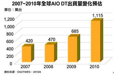 平價一體式桌上型計算機(All In One PC;AIO PC)在2009年創(chuàng)下685萬臺,成長45.7%后,DIGITIMES Research預(yù)估2010年將進一步提高至1,115萬臺,成長62.8%,展現(xiàn)新興產(chǎn)品的強勁成長力道。