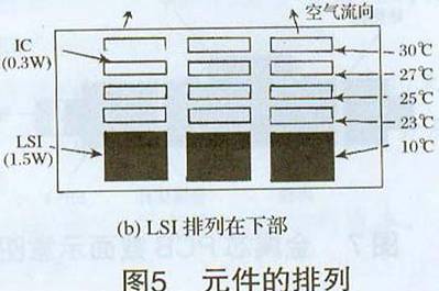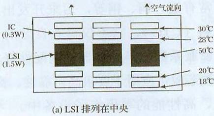 熱性能相同發(fā)熱元器件布置:圖5顯示PCB上安裝IC(0.3W),LSI(1.5W)時溫度上升的實(shí)測值。按圖5(a)排列,IC的溫度上升值是18℃-30℃,LSI溫度上升值是50℃。按圖5(b)排列,LSI溫度上升值是40℃,比圖5(a)排列還要低10℃。