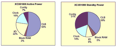 圖2所示為XC3S1000的活動功耗和待機功耗分解圖。據(jù)報告顯示,活動功耗是設(shè)計在高溫下活動時的功耗,包括動態(tài)和靜態(tài)功耗兩部分。待機功耗是設(shè)計空閑時的功耗,由額定溫度下的靜態(tài)功耗組成。CLB在活動功耗和待機功耗中占最主要部分,這不足為奇,但其他模塊也產(chǎn)生可觀的功耗。I/O和時鐘電路占全部活動功耗的1/3,如果使用高功耗的I/O標(biāo)準(zhǔn),其功耗還會更高。[page]