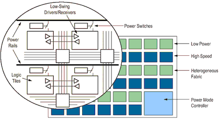 圖3所示為具有上述某些概念的FPGA架構(gòu),其可編程異構(gòu)架構(gòu)由高速度和低功耗兩個區(qū)組成。一個片上功耗模式控制器可管理各種降功耗模式,即深睡眠模式、懸掛模式和休眠模式。在架構(gòu)內(nèi)部,可以用專用的供電開關(guān)關(guān)掉每個邏輯塊的電源。通過布線架構(gòu)的通信信號流經(jīng)低擺幅驅(qū)動器和接收器,以降低互連功耗。