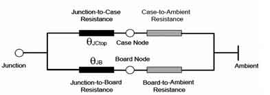 這樣就可以根據(jù)公式RJX=(TJ-TX)/Ploss求出結(jié)點(diǎn)到環(huán)境的熱阻RthJA(RthJA=RthJS+RthSA)。有關(guān)RthJA的計(jì)算,這里只介紹一種簡(jiǎn)單的熱模型(Compactthermalmodel)2R模型,即Two-ResistorModel。其理論依據(jù)如圖4所示。
