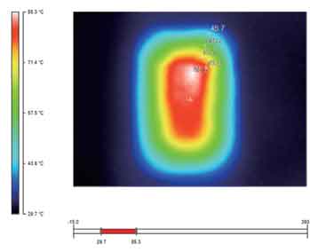 圖6~9是利用Ti20拍攝的金升陽(yáng)公司12W產(chǎn)品的熱圖像。通過這些圖片,我們不僅可以清晰地看出整體的熱分布(相同的溫度,所用的顏色是一致的),還可以借助其提供的軟件分析每一個(gè)元器件此時(shí)對(duì)應(yīng)的溫度值,如幾個(gè)溫度相對(duì)較高的元器件的溫度值分別如表1所示。