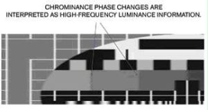 如果沒(méi)有發(fā)生亮度-色度分離,載波正循環(huán)或反循環(huán)時(shí),顏色信息使畫面更亮或更暗。同時(shí)顏色信息也會(huì)錯(cuò)誤地出現(xiàn)在圖像的黑白部分(圖2)。