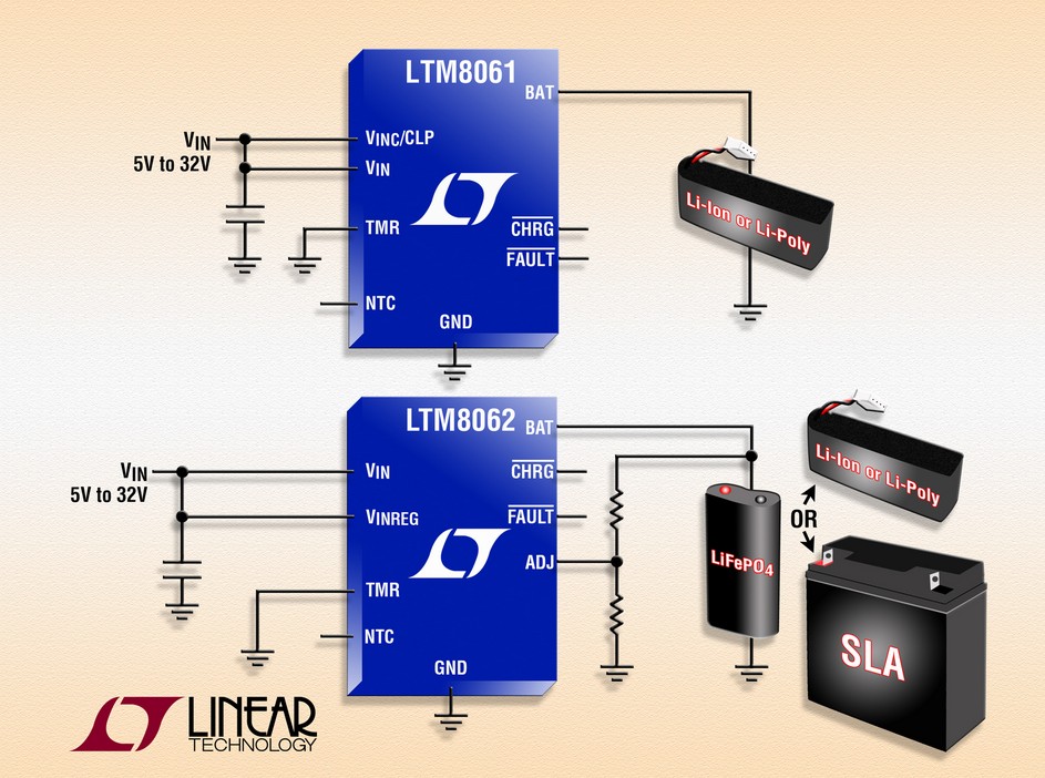 LTM8061特別適用于給鋰離子電池或鋰聚合物電池充電,并具有 4.1V、4.2V、8.2V 和 8.4V的浮動(dòng)電壓。一個(gè)可在外部調(diào)節(jié)的浮動(dòng)電壓使 LTM8062 能支持單節(jié)和多節(jié)鋰離子電池、鋰聚合物電池、磷酸鐵鋰電池 (LiFePO4) 和密封鉛酸 (SLA) 電池充電至 14.4V。