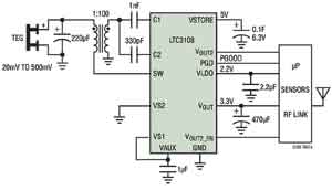 圖2所示電路運用一個小型升壓型變壓器來提高LTC3108輸入電壓源輸入的電壓,而LTC3108為無線檢測和數(shù)據(jù)采集提供一個完整的電源管理解決方案。