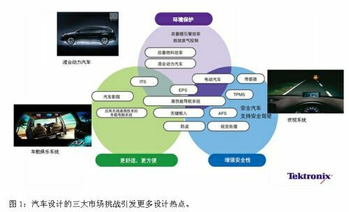 然而,面對日益復雜的汽車設計需求,特別是要推出中高端和商用的新能源汽車之時,自主創(chuàng)新和開發(fā)之路并非坦途。泰克科技的專家曾在不久前舉辦的一場汽車電子技術論壇上以擁有“100多個ECU、軟件代碼已經達到700萬行”的豐田Lexus460汽車為例,強調了電子部件在汽車特別是高端汽車中所占據的比例越來越高。“如圖1,汽車電子關乎目前汽車設計的三大市場挑戰(zhàn),即如何滿足生態(tài)(環(huán)境保護)、更舒適方便和增強安全性的要求,而圍繞解決這些挑戰(zhàn)的系統(tǒng)和子系統(tǒng)正是目前汽車電子設計的熱點和難點。”他指出。“而局域網、動力系統(tǒng)、電子控制單元和數字RFID的應用在改善汽車生態(tài)學、安全性和舒適性方面扮演了重要的角色。