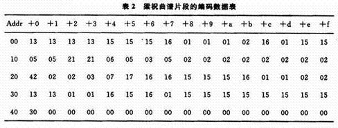 設(shè)音符的6位二進(jìn)制編碼中,最高位為間斷音控制,中間2位為音程碼,最低3位為音名碼。每個(gè)8分音存放于1個(gè)存儲單元,四分音符碼占2個(gè)存儲單元。若音名碼用其簡譜數(shù)符對應(yīng)的二進(jìn)制碼表示,而低、中、高三個(gè)音程分別用"01”,“00",“10”三組碼表示,“11”為結(jié)束符碼,則圖3曲譜碼存儲表如表2所示。表中6位二進(jìn)制音符碼用2位八進(jìn)制數(shù)表示。