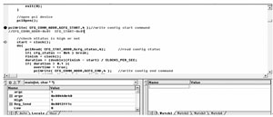 以配置開始指令的發(fā)送為例,從圖3圖4兩圖中可以看出軟硬件交互過(guò)程中的指令發(fā)送方式,在VC++中單步調(diào)試,發(fā)送一個(gè)開始指令0x01到配置命令寄存器地址0x01,通過(guò)硬件模塊的接口動(dòng)作,用嵌入式存儲(chǔ)器SignalTapII中捕捉到LA的數(shù)據(jù)為1h,LD上的數(shù)據(jù)為1h后ConfigStart寄存器置高,配置開始。