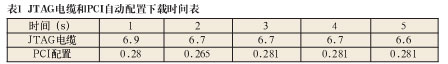 為了對(duì)比基于PCI總線的FPGA高速配置方案與基于ByteBlasterIIJTAG下載電纜的速度性能,首先使用QuartusII7.1軟件采用JTAG方式對(duì)FPGA2配置5次,計(jì)算每次下載所示時(shí)間,得到如表1中所示的數(shù)據(jù);再使用本系統(tǒng)中基于PCI總線的配置功能對(duì)FPGA2配置5次,軟件會(huì)自行計(jì)算總的下載時(shí)間,得到如表1中所示的數(shù)據(jù):