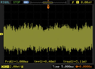 圖3是用示波器測(cè)得的某個(gè)模數(shù)混合電路的模擬部分電源電壓波形,由于示波器的帶寬很大,波形中大部分是數(shù)字電路引入的寬帶開(kāi)關(guān)噪聲,幅度為8.4mVpp。一般情況下,8.4mVpp電源紋波和噪聲符合人們的“心理期望”,因而就認(rèn)為電源沒(méi)有問(wèn)題(電源影響被低估)。