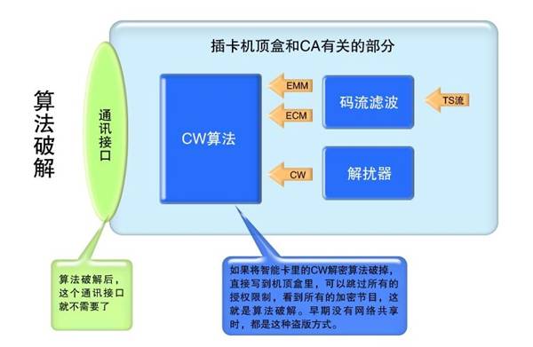 圖六是傳統(tǒng)CA的破解步驟,只要解加密的CW算法被攻破,整個CA就算完了,就可以在此基礎(chǔ)上完成圖二中的算法破解和圖四、圖五中的網(wǎng)絡(luò)共享。