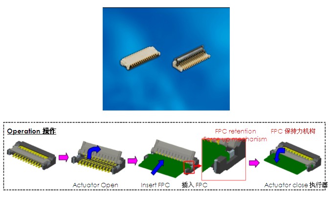 FCI可提供高度最低的FFC/FPC連接器:0.5毫米間距,0.7毫米高度,反向觸發(fā)執(zhí)行器ZIF(零插入力),用于背景燈和觸摸屏連接; 0.2毫米間距,0.9毫米高度,零插入力,適用于顯示器,鍵盤和揚聲器連接。