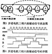 驅(qū)動子程序主要負(fù)責(zé)生成步進(jìn)電機(jī)驅(qū)動器所需要的信號。當(dāng)上行鍵或下行鍵按下,或者根據(jù)主程序運行結(jié)果,需要提升或降落周轉(zhuǎn)箱托架,主程序會調(diào)用步進(jìn)電機(jī)驅(qū)動子程序。步進(jìn)電機(jī)采用三相六拍工作方式,根據(jù)絲杠付螺紋間距,計算出步進(jìn)電機(jī)每步進(jìn)程,再根據(jù)周轉(zhuǎn)箱板間距,確定不同工況下,步進(jìn)電機(jī)的正/反轉(zhuǎn)步數(shù),這些步數(shù)保存在各相應(yīng)存貯器里,供主程序調(diào)用驅(qū)動子程序時使用。圖3和圖4分別為步進(jìn)電機(jī)三相六拍工作方式時驅(qū)動信號的狀態(tài)圖和時序圖。