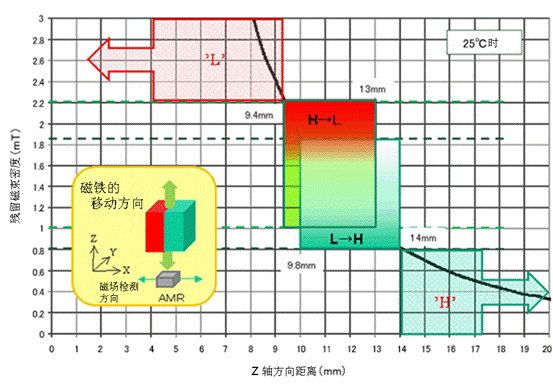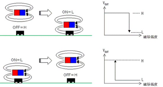 AS系列能夠通過磁鐵和傳感器之間的距離改變來檢測出磁通密度的變化,控制傳感器輸出信號的開關(guān)(高(H)<=>低(L)),如圖5所示。當磁鐵接近傳感器,使磁場的強度變大,則傳感器的輸出就會由“高”變“低”,反之則由“低”變“高”。