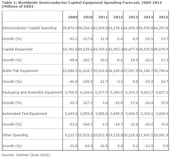 半導體資本設備市場的所有領(lǐng)域預計都將在2011年呈現(xiàn)增長態(tài)勢(見表一)。 Gartner分析師表示,2011年的支出是由積極的晶圓設備制造支出,處于領(lǐng)先的集成設備制造商(IDM)邏輯能力的加速生產(chǎn),以及內(nèi)存公司加速雙重曝光等因素推動的。2012年,半導體資本設備支出將下滑2.6%,隨后將在2013年增長8.9%。隨著內(nèi)存供過于求的影響,周期性的下跌應該在 2013年底出現(xiàn)。