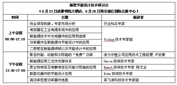 [page]新型節(jié)能設(shè)計(jì)技術(shù)研討會(huì)以風(fēng)能太陽(yáng)能發(fā)電與節(jié)能設(shè)計(jì)為主題,圍繞智能電源、逆變器設(shè)計(jì)、智能控制、馬達(dá)控制、新型電子元器件與模塊的應(yīng)用展開探討,來自知名廠商的技術(shù)專家將分享逆變器設(shè)計(jì)、馬達(dá)控制、變頻技術(shù)、電力電子技術(shù)在風(fēng)能/太陽(yáng)能、工業(yè)電子、通信設(shè)備、軍工上的應(yīng)用解決方案和節(jié)能設(shè)計(jì)技術(shù)。