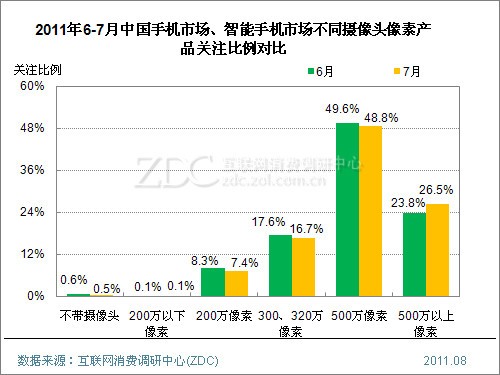 (圖) 2011年5-6月中國3G手機(jī)市場不同像素產(chǎn)品關(guān)注比例對比