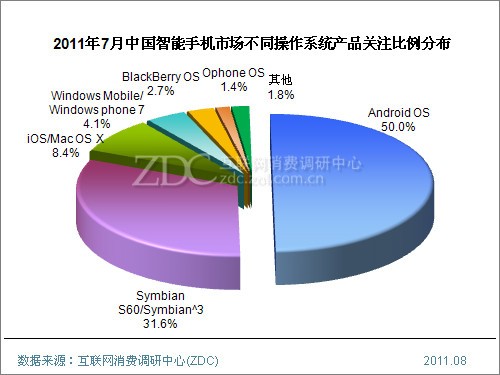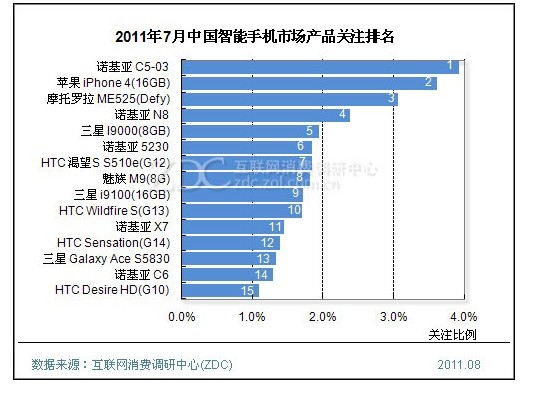 (圖) 2011年7月中國智能手機(jī)市場品牌關(guān)注比例分布[page]