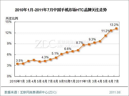 ZDC統(tǒng)計(jì)數(shù)據(jù)顯示,中國整體手機(jī)市場上,2010年1月至今,HTC品牌關(guān)注比例呈現(xiàn)出直線上升走勢,2010年1月僅為3.5%,如今已經(jīng)達(dá)到13.2%,且在中國手機(jī)市場品牌排名中躋身前三甲。
