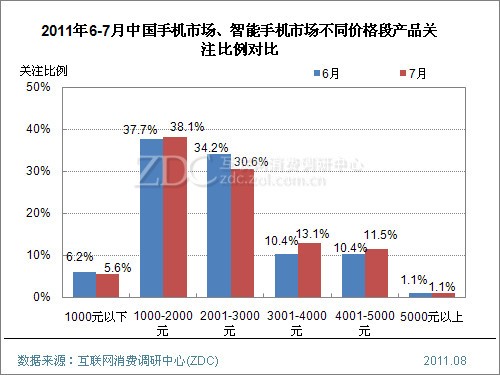 (圖) 2011年6-7月中國智能手機(jī)市場不同價格段產(chǎn)品關(guān)注比例對比