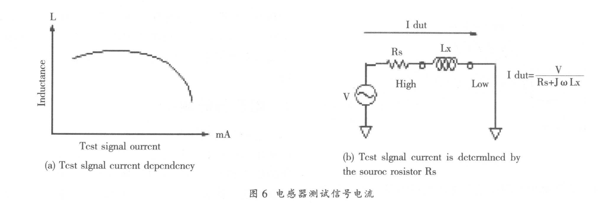 磁性電感器與測(cè)試信號(hào)電流的關(guān)系如圖6 (a)所示。電感量隨測(cè)量電流的大小而不同, 即使將兩臺(tái)不同的儀器設(shè)置為同樣的輸出電壓, 如果它們的源阻抗不同, 它們的輸出電流也將不同, 請(qǐng)參考圖6 (b)。有些磁性電感器的電感量與流過(guò)電流的關(guān)系很大, 電流的變化可導(dǎo)致電感值成倍地變化。我們多次遇到元件制造廠與元件使用廠家的糾紛就源于此。他們用不同的儀器測(cè)量同一產(chǎn)品的結(jié)果有很大的不同, 進(jìn)而懷疑儀器有問(wèn)題, 但儀器經(jīng)過(guò)我們計(jì)量校準(zhǔn)是合格的。其實(shí)就是因?yàn)閮x器的源阻抗不同而導(dǎo)致通過(guò)測(cè)試件的電流不同, 測(cè)量結(jié)果當(dāng)然也就不一致。因此一些高檔的LCR 表有電壓、電流監(jiān)視器功能, 可監(jiān)測(cè)實(shí)際加在測(cè)試件上的電壓及流過(guò)測(cè)試件的電流。