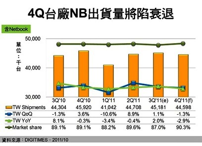2011年第三季返校商機(jī)未顯現(xiàn),已為後續(xù)筆記型(NB)市場(chǎng)買氣不振留下伏筆,DIGITIMES Research 資深分析師兼主任簡(jiǎn)佩萍預(yù)估,第四季臺(tái)廠 NB 出貨量將再度陷入較上季衰退局勢(shì),幅度為1.3%。全球NB市場(chǎng)則將衰退更多,為4.8%,單季市場(chǎng)規(guī)模恐再度未能達(dá)到5,000萬(wàn)臺(tái)水準(zhǔn),僅及4,939.7萬(wàn)臺(tái)。