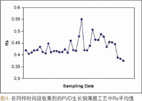 這種設(shè)備最初的一種應(yīng)用是監(jiān)測(cè)一系列物理氣相淀積(PVD)的反應(yīng)腔,這些反應(yīng)腔在銅互連金屬化制程中被用來(lái)淀積TaN/Ta/Cu襯墊層和籽晶層。這種監(jiān)測(cè)作為標(biāo)準(zhǔn)的平面電阻,膜厚量測(cè)的補(bǔ)充而存在。薄膜堆棧中Ta和Cu成分的織構(gòu)強(qiáng)度和譜線展寬數(shù)據(jù)都需要收集。TaN層具有無(wú)定形結(jié)構(gòu),因此無(wú)法監(jiān)測(cè)。圖3說(shuō)明了一個(gè)從銅元素峰寬控制圖表中輸出的例子。數(shù)據(jù)的趨勢(shì)穩(wěn)步向上,表明PVD銅籽晶的平均晶粒大小隨著時(shí)間在減小。圖4說(shuō)明了在相應(yīng)的Rs圖表中類似但并不十分顯著的增加。隨后的設(shè)備診斷發(fā)現(xiàn)受影響的反應(yīng)腔一個(gè)閥門有空氣泄漏的現(xiàn)象。泄漏影響到濺射工藝,進(jìn)而影響銅籽晶層的淀積,這一過(guò)程極有可能是在淀積和淀積之后的自退火過(guò)程中,由于銅在Ta表面的遷移率下降造成。更換了閥門之后,Rs和銅元素峰寬的值都變小,我們從圖3和圖4控制圖表中的最后三個(gè)數(shù)據(jù)點(diǎn)可以看出。