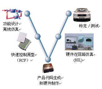 汽車電子產(chǎn)品軟件開發(fā)流程是“V”形開發(fā)流程。“V”形開發(fā)流程分為五個階段,即功能設(shè)計、原型仿真、代碼生成、硬件在回路仿真-HIL、標定。