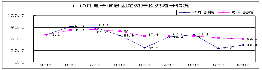 今年1-10月,電子信息產(chǎn)業(yè)固定資產(chǎn)投資持續(xù)高速增長,500萬元以上項目完成固定資產(chǎn)投資7361億元,同比增長60.1%,增速高于工業(yè)投資33.5個百分點。但從9月份開始,投資增速開始回落,9、10月份分別同比增長35.6%和44.4%,增速低于8月份(70.8%)35.2和26.4個百分點,同時10月份完成投資869.5億元,環(huán)比下降2.3%。