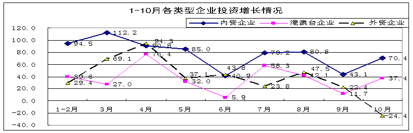 1-10月,內(nèi)資企業(yè)完成投資5481億元,占全行業(yè)的74%,同比增長72.6%,高于全行業(yè)12.5個百分點,其中私營企業(yè)增勢突出,同比增長達100.9%。外商投資和港澳臺企業(yè)分別完成投資1065和815億元,同比增長30.8%和34.1%,低于全行業(yè)29.3和26個百分點,其中外商投資10月份下降24.4%。
