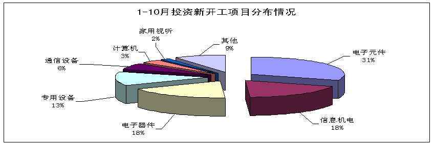 1-10月,電子信息產(chǎn)業(yè)新開工項目5973個,同比增長61.9%,增速比前三季度提高15個百分點。其中電子元器件、信息機電和信息化學(xué)品制造行業(yè)新開工項目數(shù)增長均超過60%,個數(shù)占全行業(yè)71%;通信、計算機和視聽設(shè)備等整機行業(yè)新開工項目占比(10%)下降3個百分點。