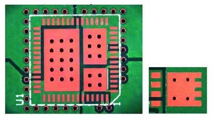 至于版圖布局,金屬較多顯然很有助益。更厚的頂層有助于降低溫度,不過(guò)也許對(duì)PCB的其余部分并不適合,因?yàn)槌杀驹黾恿?其它元件需要的更精細(xì)的間距也不可能實(shí)現(xiàn)。更大的銅面積很有用,但又會(huì)消耗PCB空間。這些應(yīng)該盡可能由焊料覆蓋,因?yàn)榻饘俦砻姹韧科岜砻娴纳嵝愿?。在多層PCB中,有時(shí)利用內(nèi)層來(lái)協(xié)助散熱。熱通孔 (填充焊料) 有時(shí)可用來(lái)把熱量擴(kuò)散到PCB的另一面去 (圖9)。