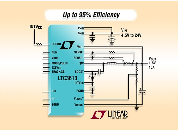 凌力爾特公司 (Linear Technology Corporation) 推出高頻、接通時間受控的同步降壓型 DC/DC 轉(zhuǎn)換器 LTC3613,該器件具差分輸出電壓采樣和時鐘同步。受控的接通時間和谷值電流模式架構(gòu)在瞬態(tài)事件時可通過提高工作頻率以實現(xiàn)非常快速的瞬態(tài)響應(yīng),從而允許 LTC3613 僅在幾個時鐘周期內(nèi)就可從大的負載步進中恢復(fù)。其 4.5V 至 24V 的輸入范圍支持多種應(yīng)用,其中包括大多數(shù)中間總線電壓。集成的 N 溝道 MOSFET 可在 0.6V 至 5.5V 的輸出電壓范圍內(nèi)提供高達 15A 的連續(xù)負載電流,從而使該器件非常適用于負載點應(yīng)用。