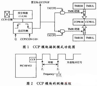 使用PIC18F452進(jìn)行頻率測量的原理如圖2所示:設(shè)置CCP模塊工作于捕捉模式,并且讓它在每個上升沿捕捉一次數(shù)據(jù),由相鄰兩個上升沿到來的時間差就可以得到被測脈沖的周期,從而也就得到了脈沖的頻率。
