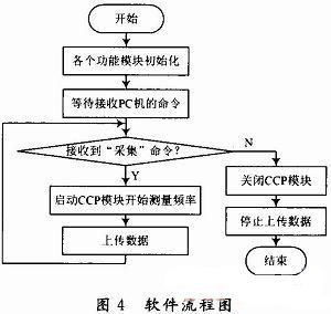 軟件的主要功能就是設(shè)置相關(guān)的功能模塊來配合硬件實現(xiàn)頻率的采集與數(shù)據(jù)的上傳,為了達(dá)到實時采集的目的,CCP模塊使用中斷方式進(jìn)行捕捉。測頻儀與PC機(jī)采用主從式通信,PIC18F452根據(jù)PC機(jī)發(fā)來的不同指令進(jìn)行相關(guān)的操作,指令共有兩種:開始采集和停止采集。當(dāng)接收到“開始采集”命令時,PIC18F452就啟動CCP模塊進(jìn)行頻率的測量并把測量結(jié)果通過串口上傳到PC機(jī);當(dāng)接收到“停止采集”的命令時,PIC18F452就關(guān)閉CCP模塊,同時停止上傳數(shù)據(jù),然后繼續(xù)等待上位機(jī)的命令。測頻儀的軟件流程圖如圖4所示。