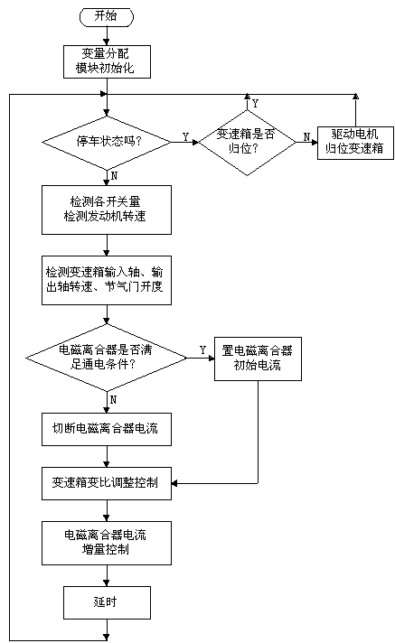 TCU控制系統(tǒng)主程序框圖如圖3所示。程序首先對(duì)內(nèi)部RAM進(jìn)行分配,然后對(duì)各功能模塊如Administrator/D轉(zhuǎn)換器、定時(shí)器、PWM波形發(fā)生器等進(jìn)行初始化。變速箱的變比在汽車(chē)每次時(shí)應(yīng)處于最小變比的位置,因此在每次停車(chē)時(shí)應(yīng)將變速箱歸位,汽車(chē)起動(dòng)后首先檢測(cè)各參數(shù),如檔位開(kāi)關(guān)、發(fā)動(dòng)機(jī)轉(zhuǎn)速、節(jié)氣門(mén)開(kāi)度、變速箱輸入、輸出軸轉(zhuǎn)速等。這些參數(shù)是控制電磁離合器電流和電動(dòng)機(jī)狀態(tài)的依據(jù)。當(dāng)需要增加變速箱的變比時(shí),TCU控制電機(jī)正轉(zhuǎn),反之控制電機(jī)反轉(zhuǎn)。電磁離合器的控制采用電流增量控制方式。它的控制好壞,直接影響汽車(chē)運(yùn)行的平穩(wěn)性和經(jīng)濟(jì)性。