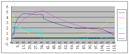 圖5為汽車(chē)速度從零加到120KM/H后又由120KM/H減到零時(shí),位置傳感器與輸入軸轉(zhuǎn)速、輸出軸轉(zhuǎn)速和電機(jī)電壓之間的關(guān)系曲線。由圖可知,當(dāng)汽車(chē)速度在從零加到120KM/H過(guò)程中,位置傳感器變比由最大開(kāi)始下調(diào)直到變?yōu)樽钚。藭r(shí)對(duì)應(yīng)電機(jī)反轉(zhuǎn)。當(dāng)車(chē)速由120KM/H開(kāi)始下降時(shí)位置傳感器先保持不變,此時(shí)電機(jī)不轉(zhuǎn),同時(shí)輸入軸轉(zhuǎn)速和輸出轉(zhuǎn)速成比例的下降,當(dāng)車(chē)速達(dá)到一定的值時(shí)位置傳感器速比由最小開(kāi)始上調(diào)直到為最大值,此時(shí)電機(jī)反轉(zhuǎn)(因測(cè)試時(shí)采用的電流傳感器為單方向的,所以圖中沒(méi)有反映出反向電流)。輸入軸轉(zhuǎn)速和輸出軸轉(zhuǎn)速不成比例的下降直至為零。從圖5可以看到車(chē)速在上升時(shí),位置傳感器速比的測(cè)試值不斷地減小(對(duì)應(yīng)的轉(zhuǎn)速比增大)。反之,車(chē)速在下降的過(guò)程中,當(dāng)車(chē)速小于某一值時(shí)測(cè)試值增加。從而實(shí)現(xiàn)了變速箱變比的自動(dòng)調(diào)整。