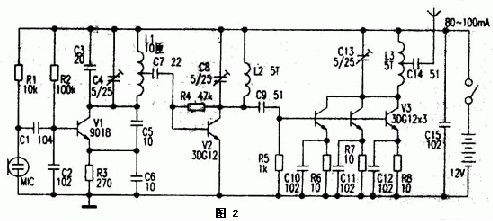 圖2為2km調(diào)頻發(fā)射機(jī)電路。本電路分為振蕩、倍頻、功率放大三級(jí)。電路中V1、C2--C6、R2、R3及L1組成電容三點(diǎn)式振蕩器,其振蕩頻率主要由C3、C4和L1的參數(shù)決定,其振蕩頻率為44~54MHz,該信號(hào)從L1的中心抽頭處輸出,再經(jīng)過(guò)C7耦合至V2放大,由C8和L2選出44~54MHz的二倍頻信號(hào),即88-108MHz,,此信號(hào)由C9耦合至V3進(jìn)行功率放大,V3由3只3DGl2三極管并聯(lián)組成,可擴(kuò)大輸出功率。該電路正常工作時(shí),電流約80-100mA。組成V3的三只3DG12可加上適當(dāng)?shù)纳崞?,以防過(guò)熱。制作時(shí)L1~L3用0.31mm漆包線在直徑3.5mm圓棒上單層平繞。