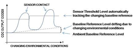 保持可靠性能。容性傳感器電極是采用PCB上的標準銅材料或柔性材料制成的。這種材料的特性會隨溫度和濕度的變化而發(fā)生改變。這種變化會使基線電平發(fā)生偏移(所有傳感器閾值電平均是以基線電平為參考的)。較大的基線偏移增加了接觸閾值電平過低或過高的風險(過低還是過高取決于基線偏移的方向)這會引起虛假的接觸誤差,或使閾值電平不是太靈敏就是不夠靈敏,導致接觸狀態(tài)的不穩(wěn)定。為保持傳感器原始的信號接觸閾值檢測電平余量(靈敏度),CDC需要自動跟蹤基線偏移誤差的幅度,并對閾值設(shè)置進行相應(yīng)的重新調(diào)整。圖2中的示例介紹了AD7147和AD7148的閾值電平如何針對因環(huán)境條件變化引起的基線失調(diào)變化進行自動跟蹤和調(diào)整。
