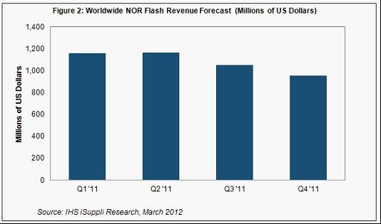 據(jù)IHS iSuppli公司的移動市場存儲報告,由于經濟形勢糟糕和泰國洪災導致PC出貨量下降,2011年第四季度NOR閃存營業(yè)收入環(huán)比下降9%。