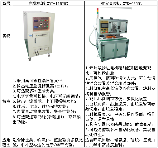 深圳市欣音達(dá)科技有限公司是一家專業(yè)研發(fā)生產(chǎn)流體控制系統(tǒng)及磁性應(yīng)用系統(tǒng)的制造企業(yè),下轄有灌膠機(jī)事業(yè)部、點(diǎn)膠機(jī)事業(yè)部及充退磁機(jī)事業(yè)部,客戶來(lái)自全球各地。中國(guó)電子展期間,欣音達(dá)科技給我們帶來(lái)了兩款先進(jìn)的產(chǎn)品,其特點(diǎn)如下表所示: