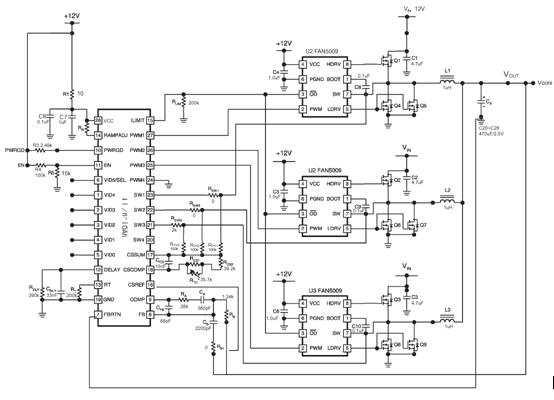 由控制器FAN5019B及3個(gè)驅(qū)動(dòng)器FAN5009組成的三相同步整流降壓式DC/DC轉(zhuǎn)換器電路如圖7所示。現(xiàn)使用條件:VIN=VCC=12V(VCC是供控制器及驅(qū)動(dòng)器的工作電壓),VOUT=1.5V,IO=65A(IO即IOUT(max)),fsw=228kHz,選擇開關(guān)管及同步整流管(采用兩個(gè)并聯(lián)組成)。