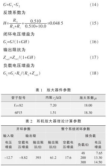輸入級放大器件選用Ecc82雙三極管,輸出級選用6P15,基本參數(shù)如表1所示。為降低輸出阻抗,以便于和阻抗較低的耳機相匹配,輸出級SRPP電路采用雙管并聯(lián)的方式工作。放大器的相關(guān)參數(shù)計算方法如下所示,其中開環(huán)電壓增益為:
